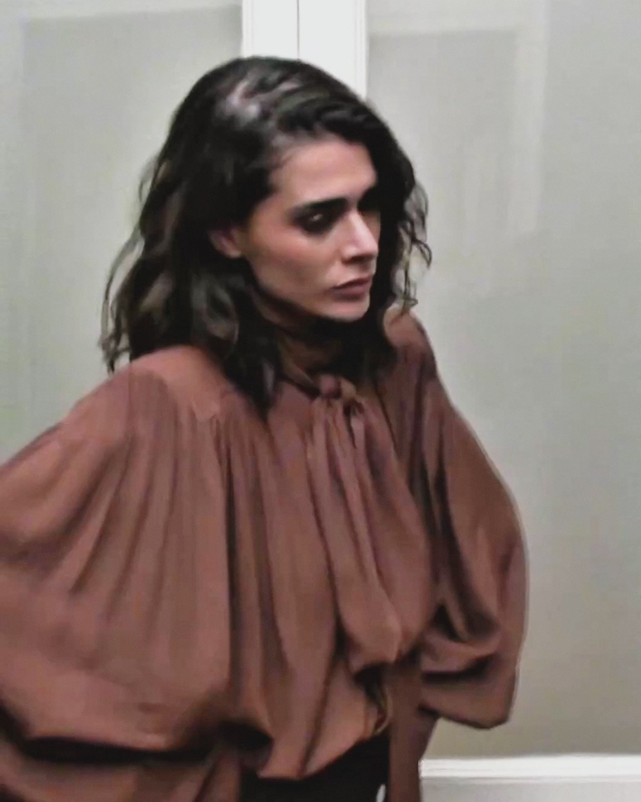 A sculptural high neck with maxi shoulder pads and extended cuffs creates a powerful, elongated silhouette